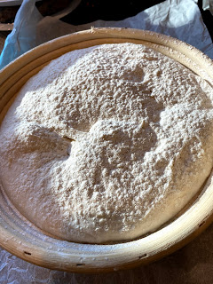 During this 1/2 hour, I prep my bannetons - these cane dough bowls. (You can get them a lot of places. Brad had one and I ordered another off of Amazon. One is slighter bigger than the other. They were in short supply and so I just took whatever I could get. I don't use the liner that comes with it. And I rarely clean in between batches. They need to be dry - if you've cleaned them, you need to let them dry for a day or so before using again.)
